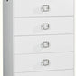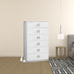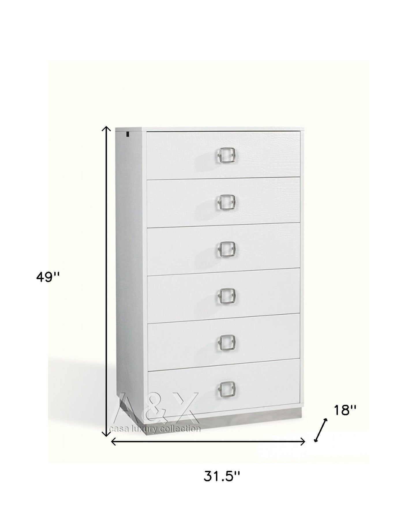 This 32" white manufactured wood + solid wood stainless steel six drawer standard chest is a practical and good looking accent for your bedroom storage and organizational needs. The space saving design of this standard chest makes it a great choice for space challenged spaces or small walls within your room. Loaded with capacity, this piece is equipped with six easy open drawers for practical and good looking clothing storage. Its a high quality piece, made from high grade manufactured wood + solid wood, stainless steel. The white coloration of this piece is neutral and will blend easily with most any decor. 49" H x 31.5" W x 18" D