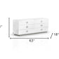 Add personality to your bedroom style and a feeling of coziness with this 63" white solid and manufactured wood six drawer standard dresser. Designed for you to stand in front of and get ready, this horizontal double dresser has a convenient and wide top area for your getting ready needs and supplies. Loaded with capacity, this piece is equipped with six easy open drawers for practical and good looking clothing storage. Its a high quality piece, made from high grade manufactured wood + solid wood. The white coloration of this piece is neutral and will blend easily with most any decor. 26" H x 63" W x 18" D