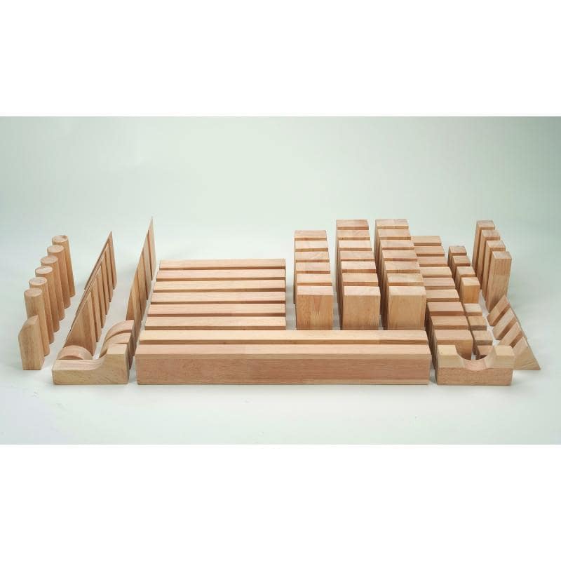 Hardwood Beginner Block Set includes 16 different shapes and 75 total blocks. Features a smooth natural finish and rounded edges for safety. Blocks cart not included. Ships UPS or FedEx Ground. Imported. GreenGuard™ Gold certified. Lifetime Warranty.