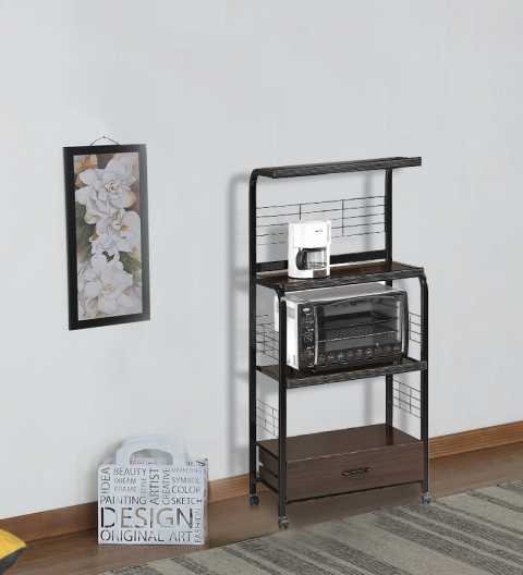 Functional, portable, and efficient, this Espresso(brown) and black metal kitchen Cart on Casters is the solution to your kitchen storage needs. It has a steel and wood construction. it scores high on its utility aspect by not just accommodating your microwave but also providing plenty of storage space. The open shelves give you quick access to commonly used items and accessories, while the single drawer provides compact kitchen storage for a wide range items. Store your small kitchen accessories, utensils, dry goods, or plates, while utilizing the wheels to push the cart away when necessary. Includes: One Kitchen cart only