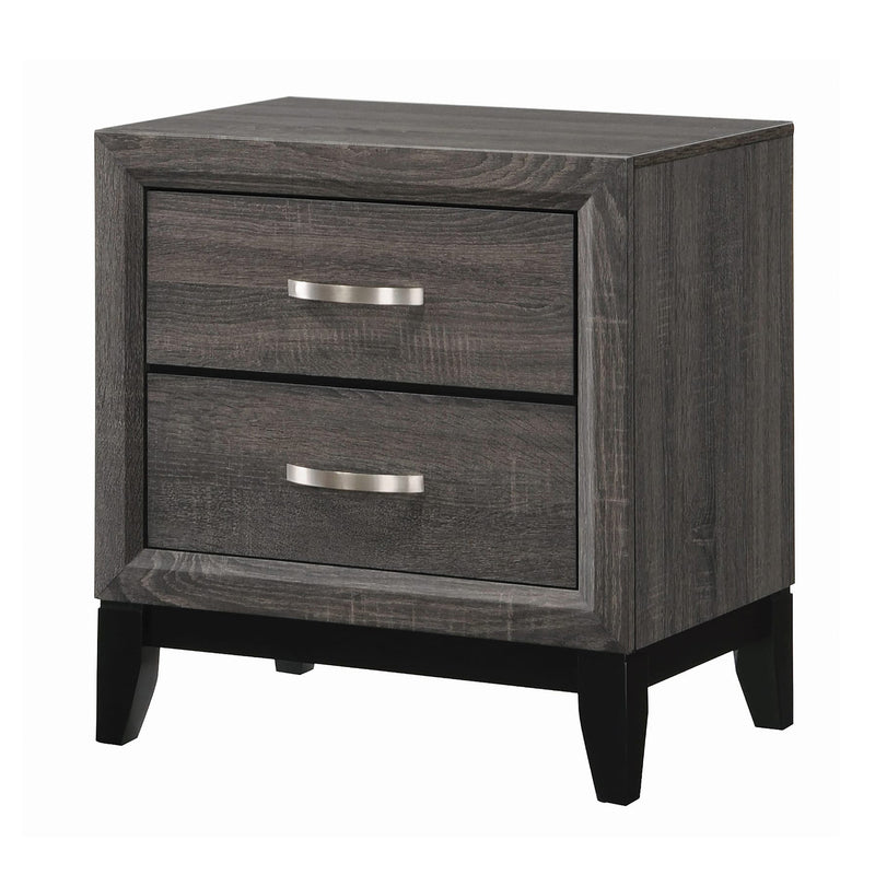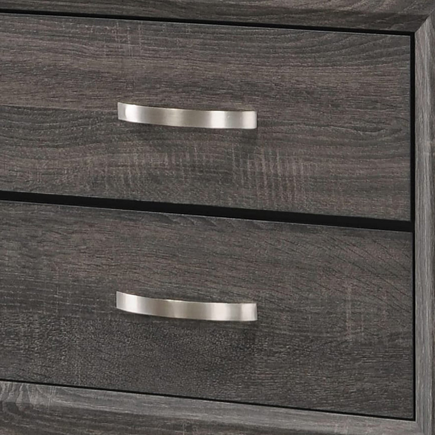 Add a convenient storage space besides your bed by incorporating this transitional style nightstand, featuring grain details and comes with 2 drawers. Constructed from the combination of wood, metal and veneer, it is accented in the hues of gray and black. It is provided with bar pull handles to facilitate easy access.